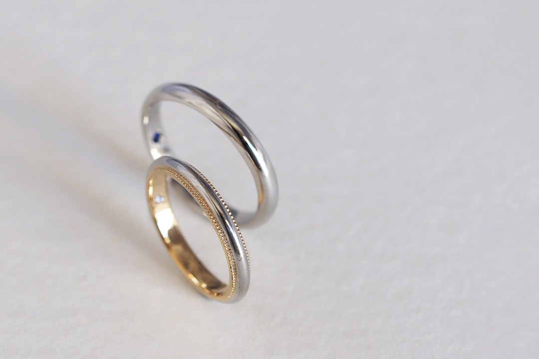 Pt900 + K18イエローゴールド 甲丸 2.5mm幅 ミル打ち ダイヤモンド Pt900 甲丸 3mm幅 鏡面仕上げ サファイア