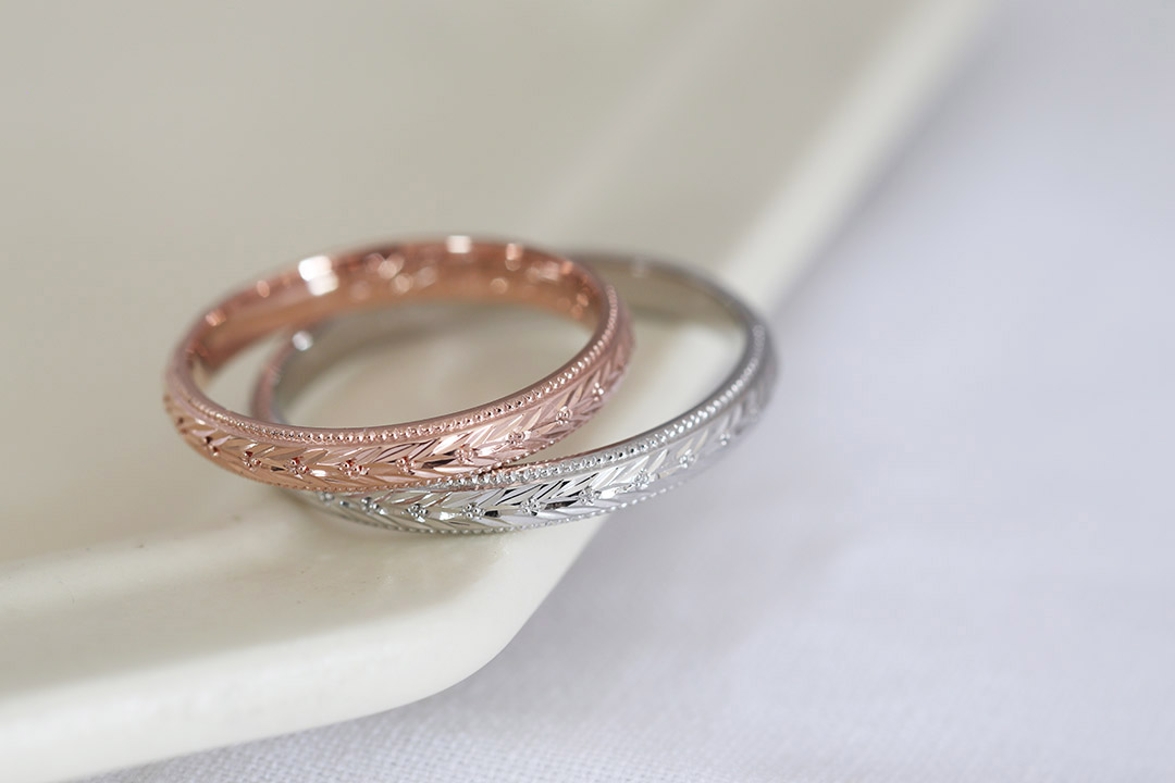 K18ピンクゴールド 甲丸 2.5mm幅 鏡面仕上げ ミル打ち 手彫り Pt900 甲丸 2.5mm幅 鏡面仕上げ ミル打ち 手彫り