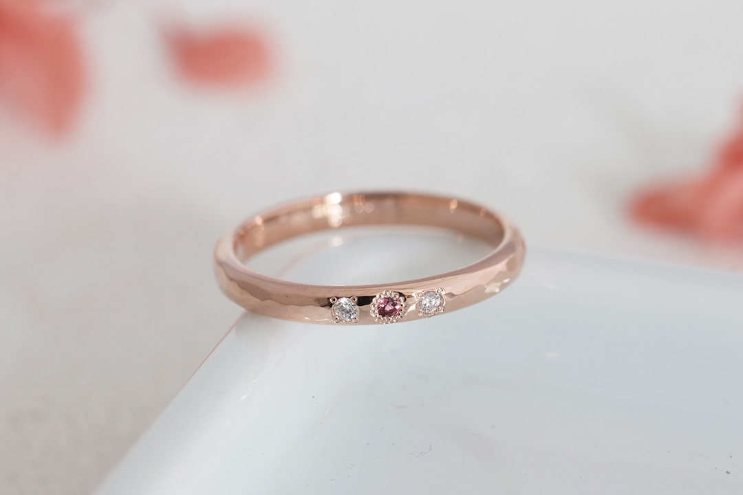K18ピンクゴールド 槌目(甲丸) 2.5mm幅 鏡面仕上げ ピンクトルマリン ダイヤモンド